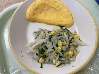 今日の献立は、減量コッペパン、オムレツ、えごまドレッシングサラダ、焼きそば、棒チーズ、牛乳です。