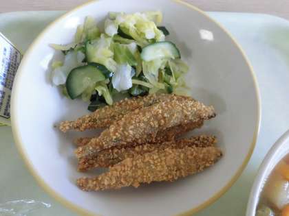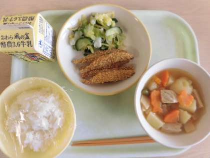 今日の献立は、ごはんきびなごのさくさく揚げ、あわせ和え、豚肉とじゃがいものうま煮、牛乳です。