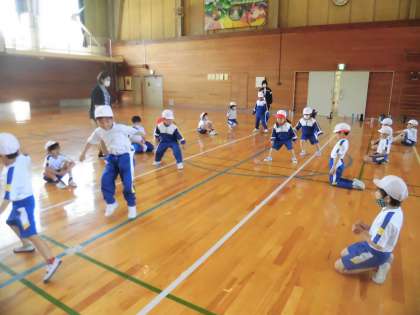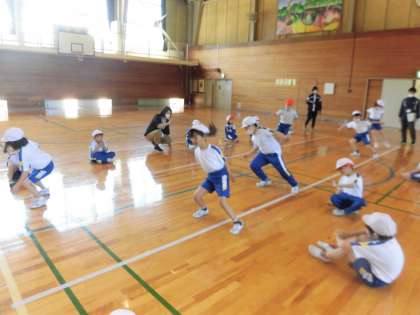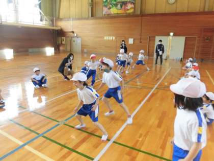 1・2年生の体育では体力テストの「反復横跳び」を行っていました。リズムよく3本の線をまたぎ、制限時間内で何回線をまたげるかを測定します。初めての1年生も先生や2年生に教えてもらって上手にすることができました。