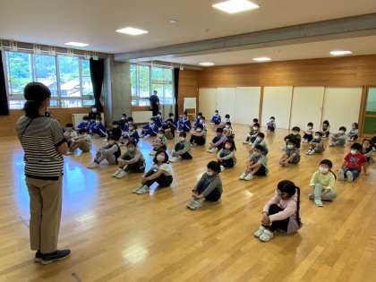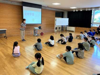 今日の4限は「全校学習」の時間でした。1年生から6年生が多目的室に集まって一緒に学習しました。