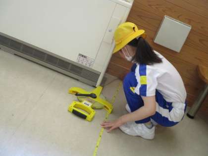 長い長さや丸いものの長さを測るときには「まきじゃく」が便利だと気付いた3年生、木の幹の周りの長さやジャングルジムの高さ、玄関の柱の周りの長さや3階廊下の長さなどを、ペアで協力して実際に測ってみました。見当をつけた長さよりもとても長いものもあり、驚いたようです。