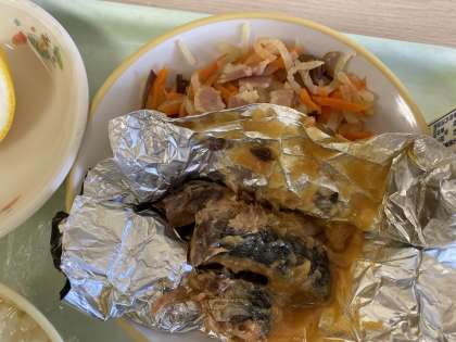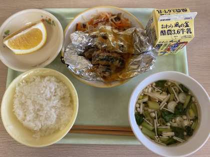 今日の献立は、ごはん、さばの銀紙焼き、大根の中華きんぴら、すまし汁、河内晩柑、牛乳です。