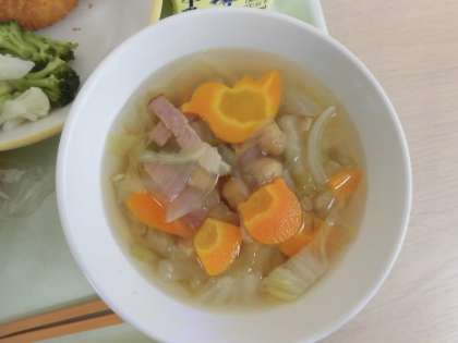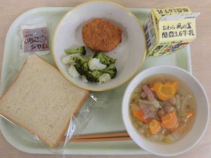ひよこ豆は、給食でいろいろな料理の具材に使われます。今日の「ひよこ豆のスープ」はベーコンや玉ねぎなどの中に入っており、しゃきっとした歯ごたえがありました。食パンにはいちごジャムがついています。あまくて食べやすくなっていました。