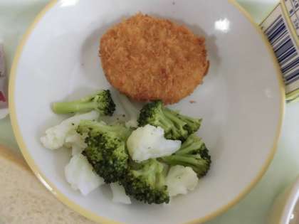 今日の献立は、食パン、コロッケ、花野菜サラダ、ひよこ豆のスープ、いちごジャム、牛乳です。