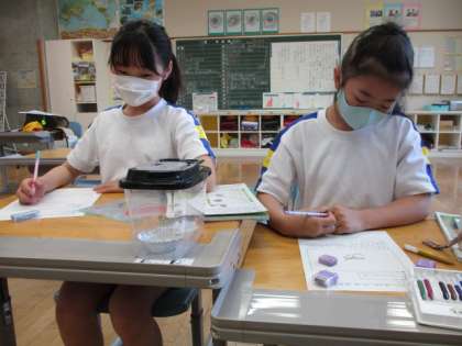学習のために教室で育てていたモンシロチョウが成虫になったので、観察カードに気が付いたことを書いた3年生は、学習後にベランダから2匹を放してやりました。