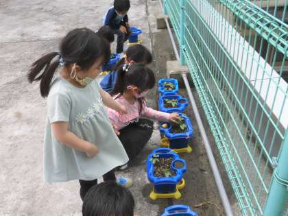 その後、ワークテラスに出て、あさがおの世話をしていました。