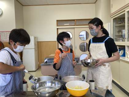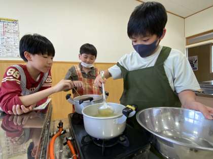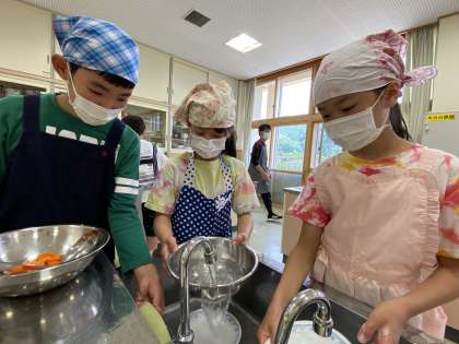 今日はじゃがいも、にんじん、キャバツを使った茹で野菜サラダを作りました。野菜の種類によって茹でるタイミングが違うことや切り方が違うことを学びました。