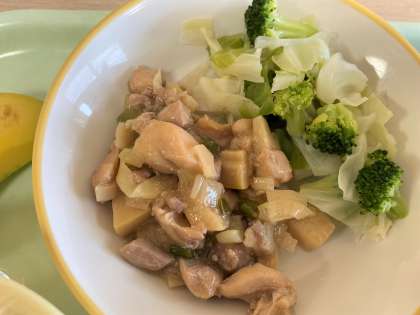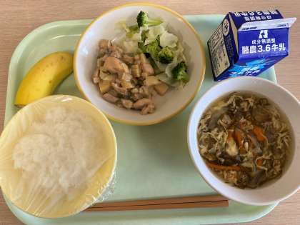 今日の献立は、ごはん、あっさりチキン、そえ野菜、卵ともずくのスープ、バナナ、牛乳です。