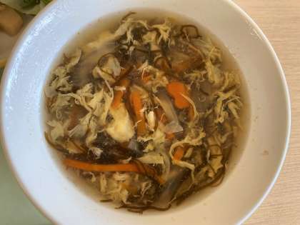 スープは、もずくのトロトロした感じが溶き卵と合わさってやさしい味です。チキンはネギやたけのことと一緒になりさっぱりした味付けです。