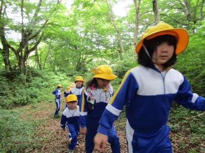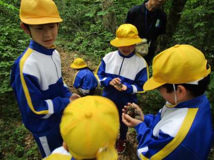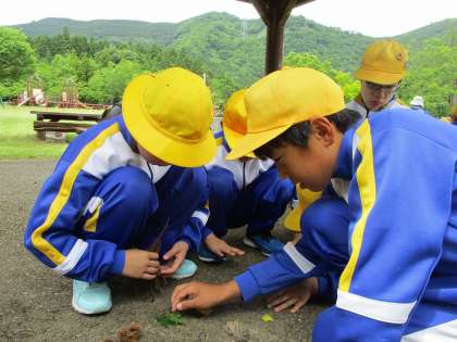 活動2の「同じものを見付けようゲーム」での様子です。森の中に行き、6年生が拾ってきた葉や枝を探しました。みんな一生懸命探しました。