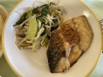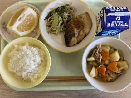 今日の献立は、ごはん、さばの塩焼き、香味和え、豚肉の南蛮煮、河内晩柑、牛乳です。