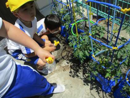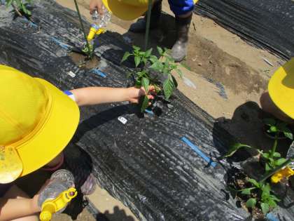生活科「わたしたちのやさいばたけ」で、野菜のお世話をがんばっています。「ピーマンが収穫できた」「大きくなった!」と喜んでいました。これからも野菜の世話をがんばっていきます。