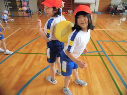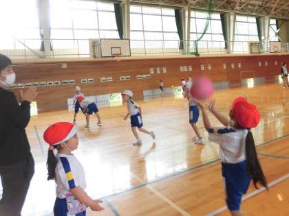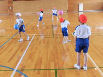 1・2年生の体育では、ボールを使っていろいろな遊びをしていました。上に放り投げて受け止めることや背中合わせにボールをはさんで立ち上がるなど。楽しみながら取り組んでいました。