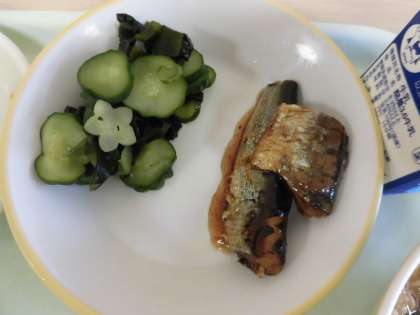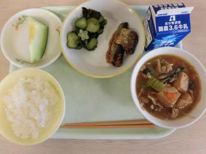 今日の献立は、ごはん、いわしの土佐煮、酢の物、厚揚げのみそ炒め、メロン、牛乳です。