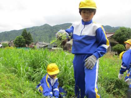 4・5年生は、昨年に植えられたらっきょう畑の草むしりに行ってきました。