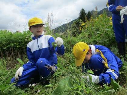 お世話してくださっている地域の方から、除草の仕方を教わり、畑に分けれて草むしりを行いました。雨が降っていたおかげで、土がやわらかくなっており大きな草も簡単に抜くことができました。
