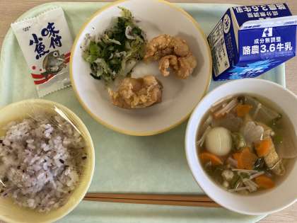 今日の献立は、雑穀いりごはん、鶏肉のから揚げ、ゆかり和え、すいとん、味付け小魚、牛乳です。