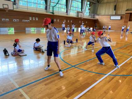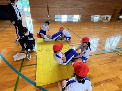 1、2限は、全校一斉に「碧っ子体力テスト」でした。縦割り班グループごとに7種目のコーナーを回ります。