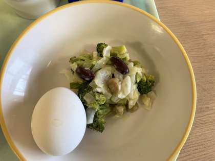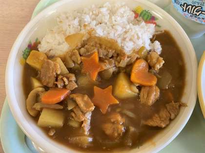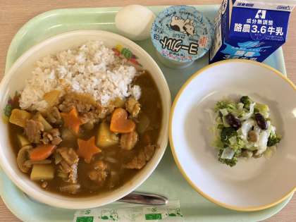 今日の献立は、カレーライス(麦ごはん)ゆで卵、ビーンズサラダ、ヨーグルト、牛乳です。