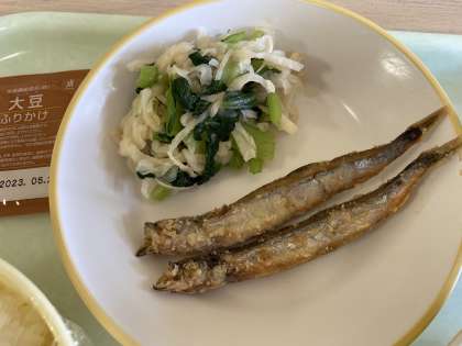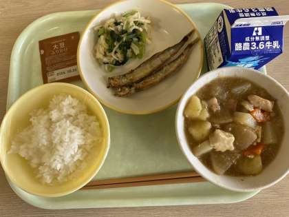 今日の献立は、ごはん、ししゃものから揚げ、はりはり和え、鶏肉とジャガイモのごま煮、大豆ふりかけ、牛乳です。