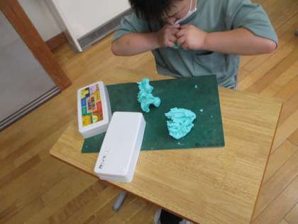 図工「にぎにぎねん土」では、ねん土をつまんだり、ひねったりしてできた形から何に見えるか想像を膨らませて取り組みました。