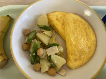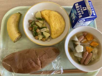 今日の献立は、ココアコッペパン、チーズオムレツ、ひよこ豆のオリーブオイル炒め、ポトフ、バナナ、牛乳です。