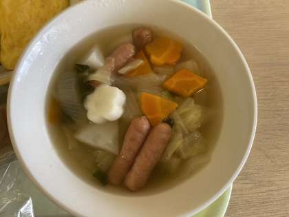 ポトフは元々はフランスの家庭料理だそうです。牛肉やソーセージなどの肉と、大きく荒く切ったニンジン、タマネギ、セロリなどの野菜類を、じっくり煮込んだ料理です。今日のポトフは、かぶがやわらかく食べやすくなっています。コッペパンは、ココアアジでいつもよりあまく感じます。