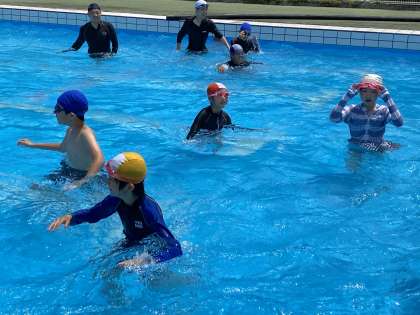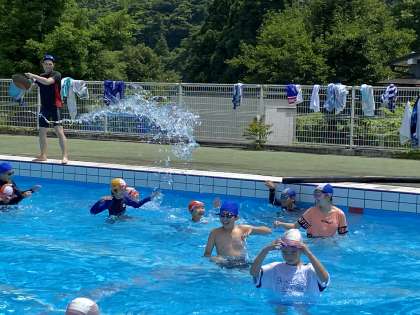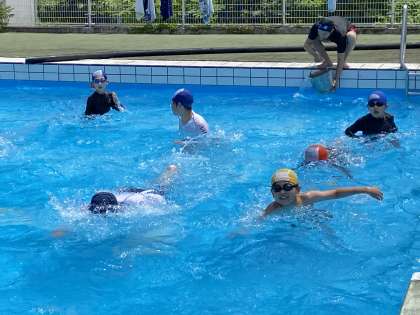 3-6年生は大プールでぐるぐる回って波をつくりました。