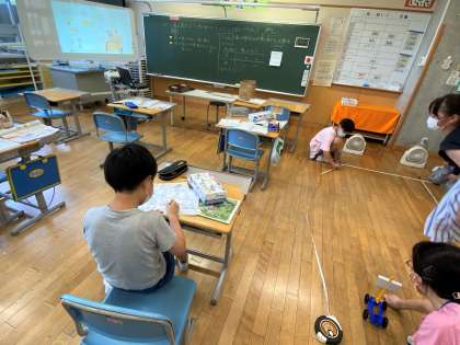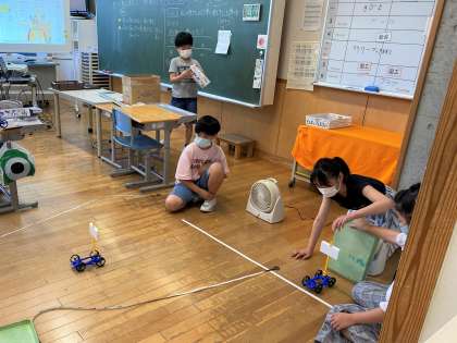 紙の帆をつけた車に風を当てて、動く距離を測定しています。風が強ければ強いほど長い距離を動くことが分かりました。