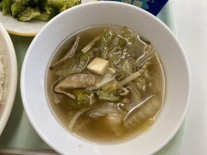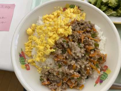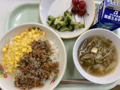 今日の献立は、豚そぼろ丼(豚そぼろ、炒り卵)ゆでブロッコリー、豆腐スープ、さくらんぼ、牛乳です。
