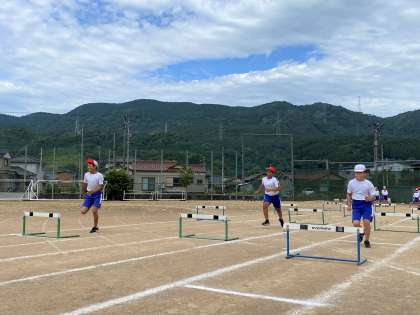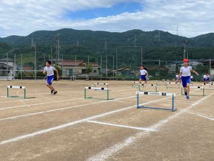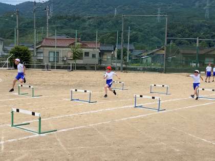 5・6年生は、ハードル走に取り組んできました。今日は、タイムを計測してます。ハードル間の歩数や跳び方を練習してきました。ハードルなしの50m走の記録にどれだけ迫れたかな。