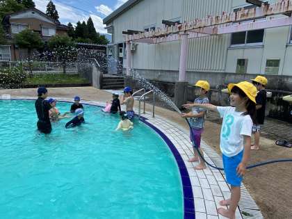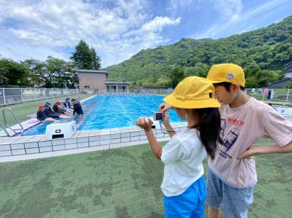 今日は、学習の様子の写真を撮ったり水のシャワーをつくったりプールサイドでできることをしました。プールに入れないのは残念ですが、プールサイドでの自分の役割を見つけることができました。