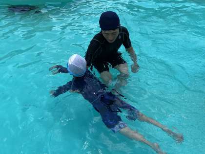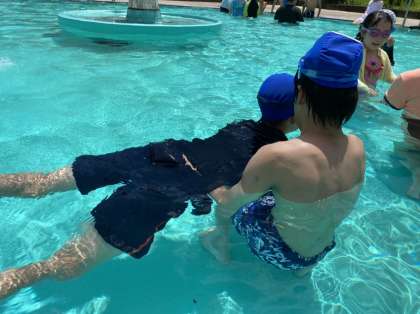小プールでは、浮き方の練習をしました。慣れない水の中ではつい体に力が入ってしまい、沈んでしまいます。そこで、友達と補助をし合いながら浮く練習をすることで安心して力を抜くことができました。
