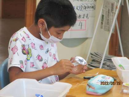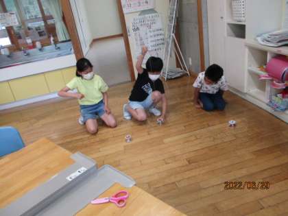 できあがると、すぐに動かしてみたくなる子供たち。「まっすぐ進んだ!」と喜ぶだけでなく、「糸を右に引っ張ると右に進むよ!」と引っ張り方を変えて発見したことを友達に伝えていました。