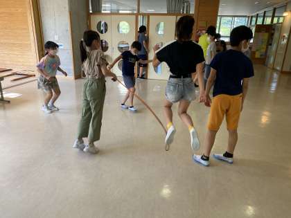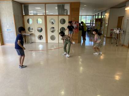 今日もとても暑いので、運動タイムは中止となりました。子供たちは廊下等の室内で縄跳びをしたり鉄棒をしたりなど、運動を楽しんでいました。
