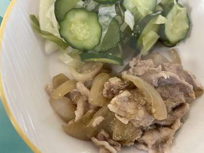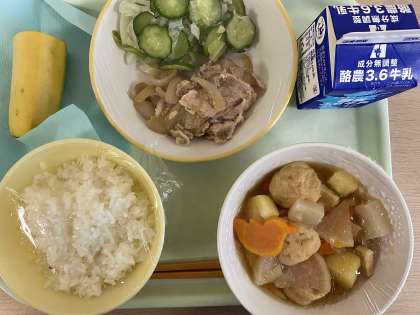 今日の献立は、ごはん、豚肉のジャンロー、きざみ和え、炊き合わせ、バナナ、牛乳です。
