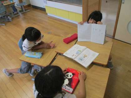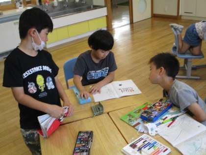 国語では、「あったらいいなこんなもの」の学習をしています。一人一人「あったらいいなこんなもの」を考え、絵と文で表しました。友達と質問し合って、その道具をより詳しく説明できるように取り組んでいます。