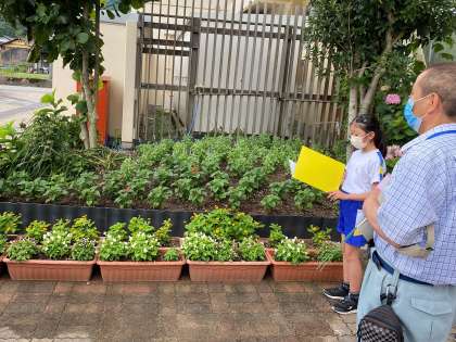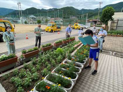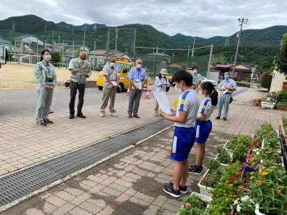 今日は、「花いっぱいコンクール」の審査がありました。富山市役所をはじめ花壇づくりの専門家の方々が来校されました。学校花壇づくりの中心になっているフラワーブック委員会の2人が代表して、今年度の花壇づくりのテーマや工夫点について説明をしました。