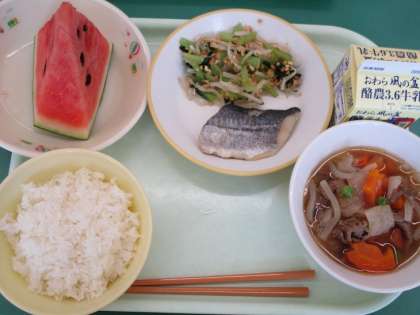 今日の献立は、ごはん、肉じゃが、鰆の塩焼き、いり大豆和え、すいか、牛乳です。