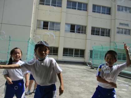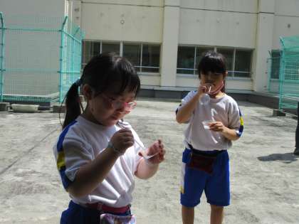 生活科の時間に、水遊びとシャボン玉遊びをしました。