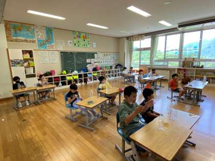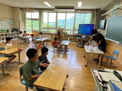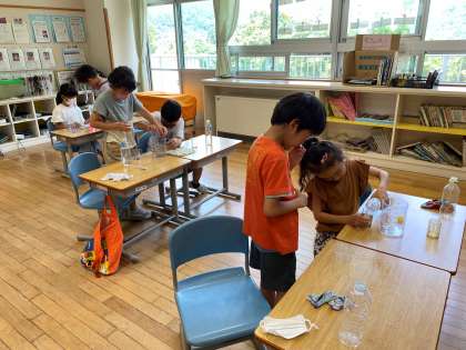 いろいろな形の100mlますに水を入れて、確かめていました。
