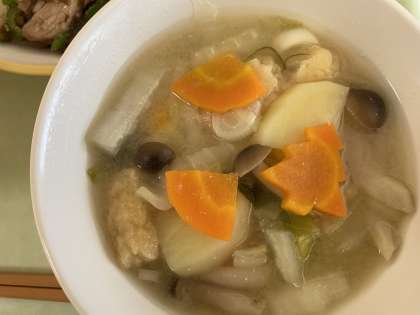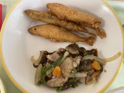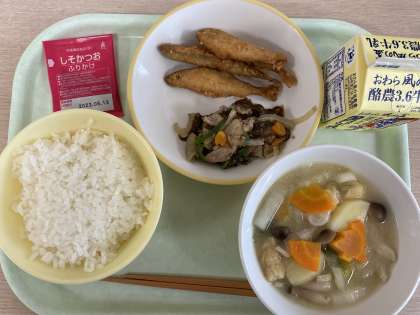 今日の献立は、ごはん、わかさぎのフリッター、もずくのチャプチェ、具だくさん汁、しそかつおふりかけです。