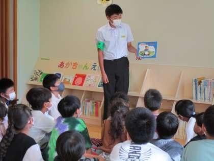 今回は、14歳の挑戦でお仕事中の中学生のお兄さんが、絵本の読み聞かせをしてくださいました。