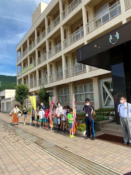 小中のPTAのみなだんと子供たちの代表が、のぼり旗をもって挨拶を呼びかけました。