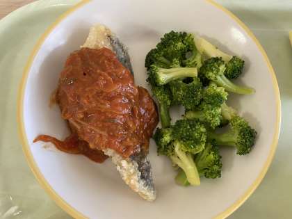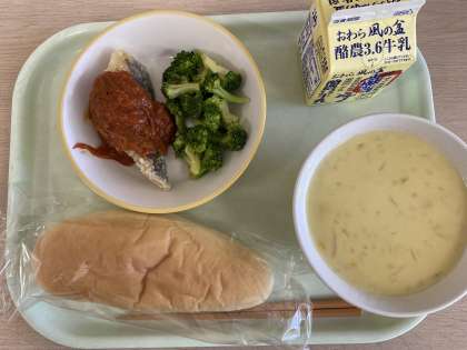 今日の献立は、コッペパン、魚のチリソースかけ、ゆでブロッコリー、コーンポタージュ、牛乳です。