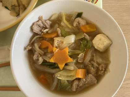 今日の献立は、ごはん、韓国風すきやき、にんじんシューマイ、昆布和え、かき氷アイスです。今日は、かき氷アイスがデザートについています。冷たくてさわやかになるサイダー味でした。今日のすきやきは、ごま油の風味の韓国風でした。