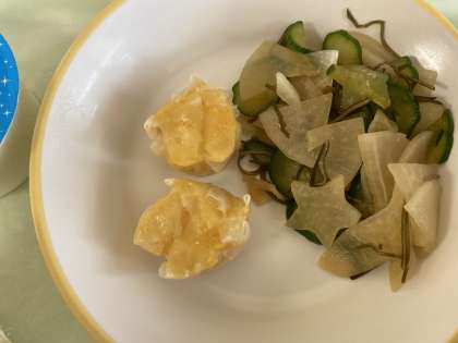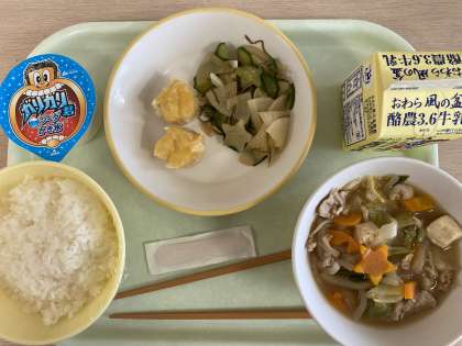 今日の献立は、ごはん、韓国風すきやき、にんじんシューマイ、昆布和え、かき氷アイスです。今日は、かき氷アイスがデザートについています。冷たくてさわやかになるサイダー味でした。今日のすきやきは、ごま油の風味の韓国風でした。
