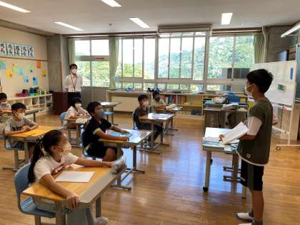 5年生の教室でも、始業式の後の学級活動で「夏休みの作品発表会」を行っていました。