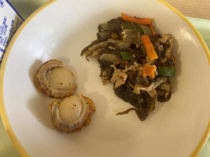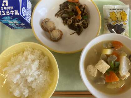 今日の献立は、ごはん、ほたての香味焼き、もずくのチャプチェ、ごまけんちん、黒糖大豆です。