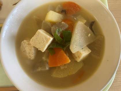 チャプチェとは、韓国語で雑菜。春雨などを炒めた朝鮮料理です。今日はもずくが入ったチャプチェです。甘辛くてごはんに合います。ごまけんちんは、ジャガイモやごぼう、大根などがたくさん入っています。生姜の香りがとてもよいです。今日もおいしくいただきました。
